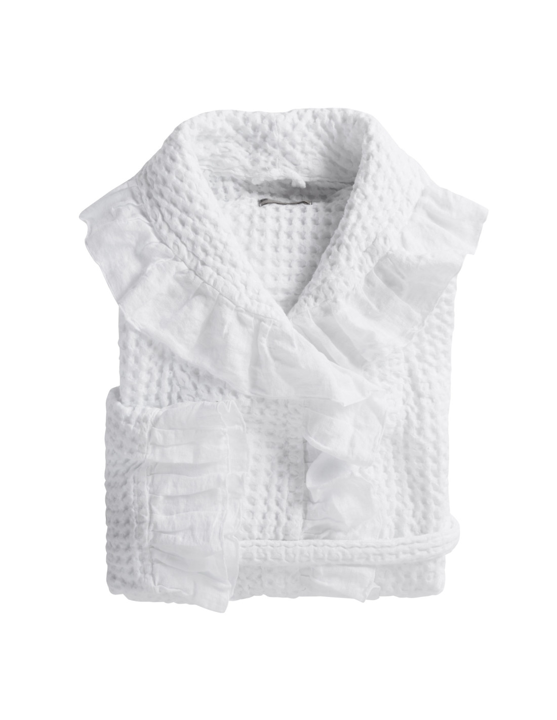 Accappatoio donna originale in pregiata lavorazione nido d’ape, con elegante collo a scialle e raffinata applicazione di rouche in lino tinto in capo.