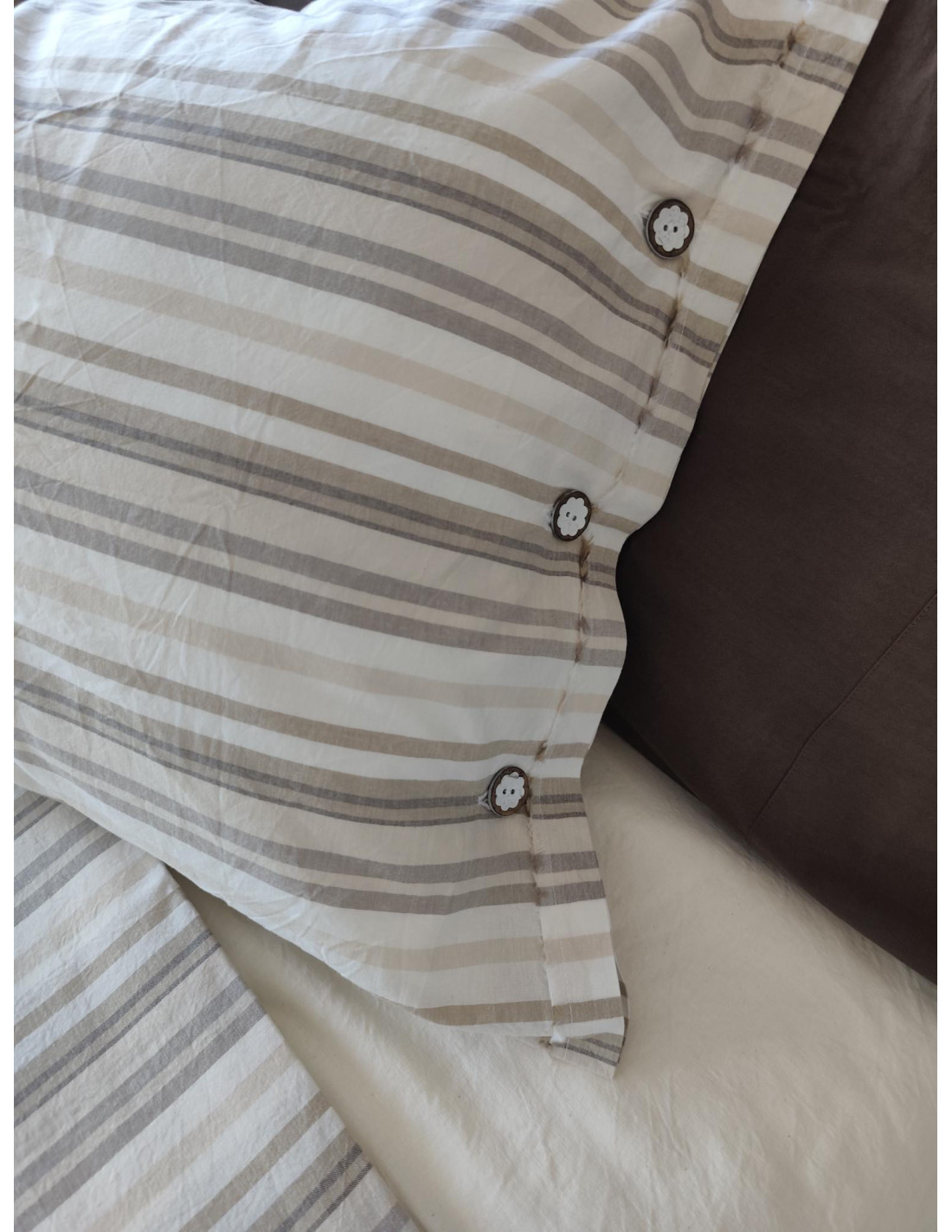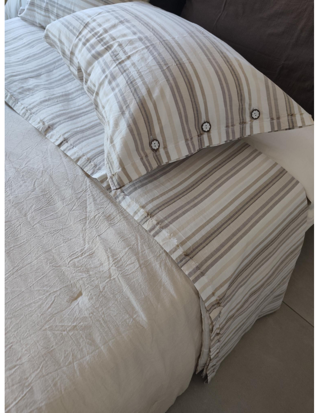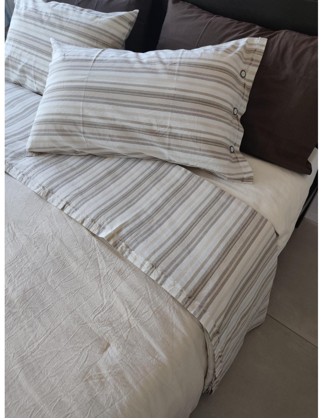 Lenzuolo sopra e federe in fantasia a righe nei toni naturali, arricchiti da delicate sfumature pastello