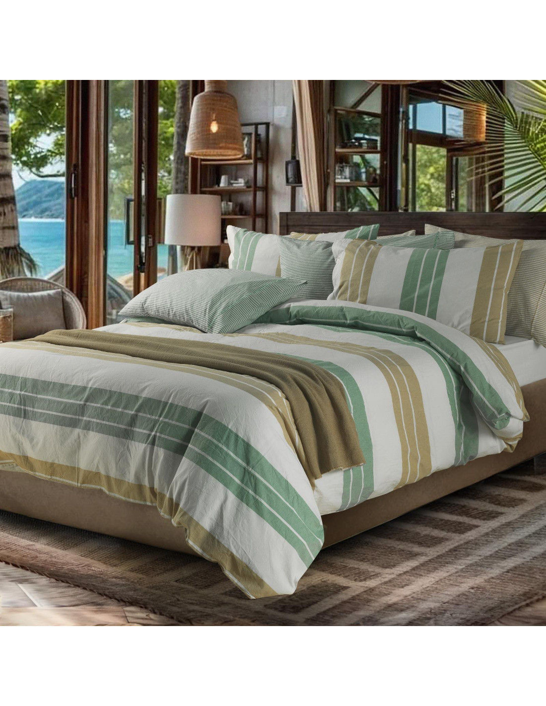 Dona stile e comfort alla tua camera da letto con questa parure copripiumino matrimoniale realizzata in 100% puro cotone tinto filo, resistente e piacevole sulla pelle.