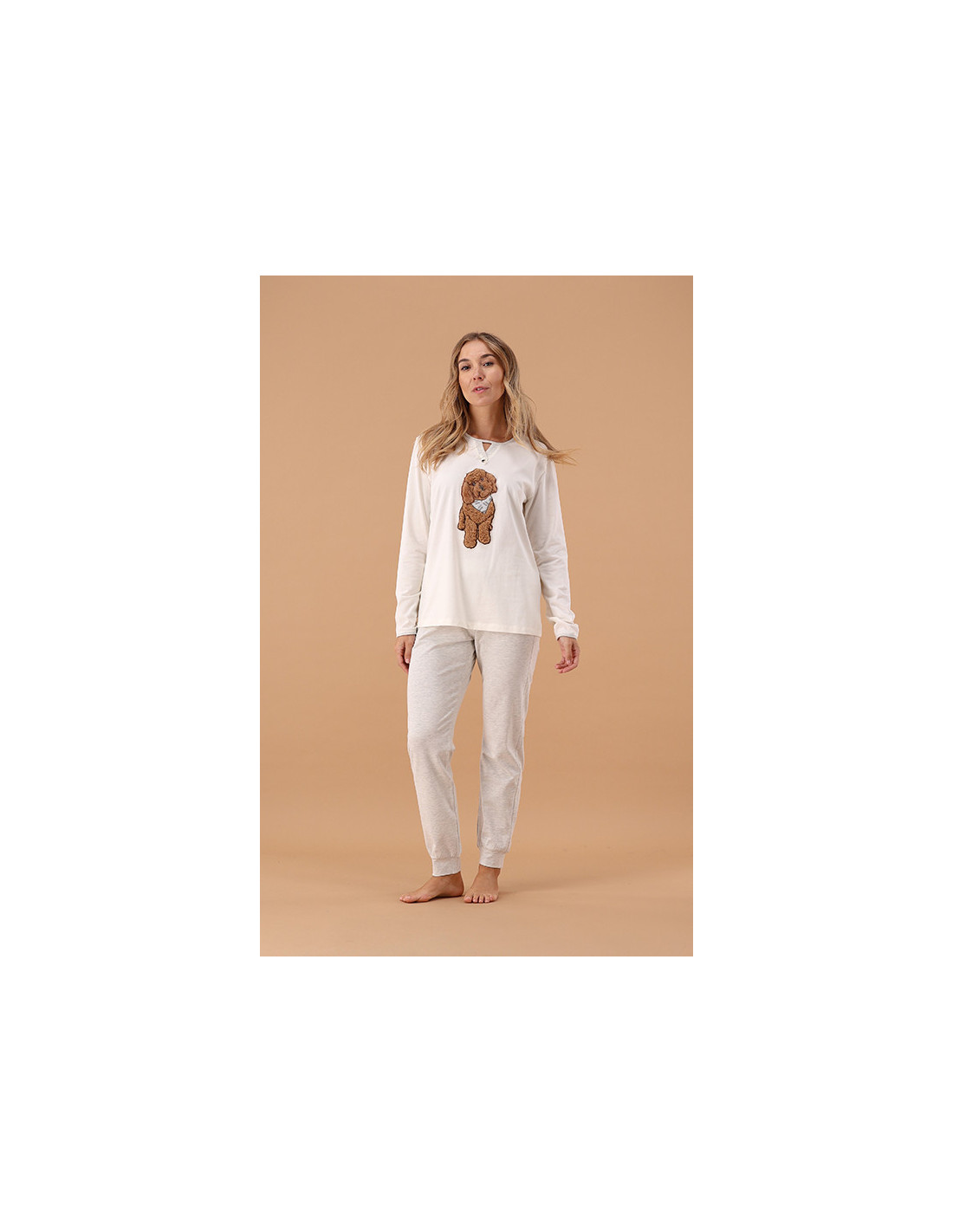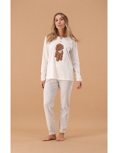 Un pigiama pensato per unire comodità, dettagli raffinati e un tocco di tenerezza. Il protagonista è un dolcissimo cagnolino applicato in pelliccetta, che rende questo capo unico e irresistibile.