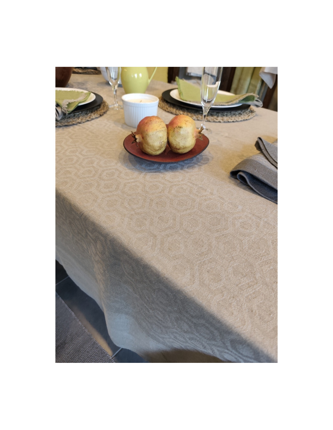 Raffinata, senza tempo e realizzata con la massima cura artigianale: questa tovaglia in pregiato tessuto jacquard unisce la delicatezza del colore écru, intramontabile e versatile, a una fantasia geometrica contemporanea che valorizza ogni ambiente, dal più classico al più moderno.