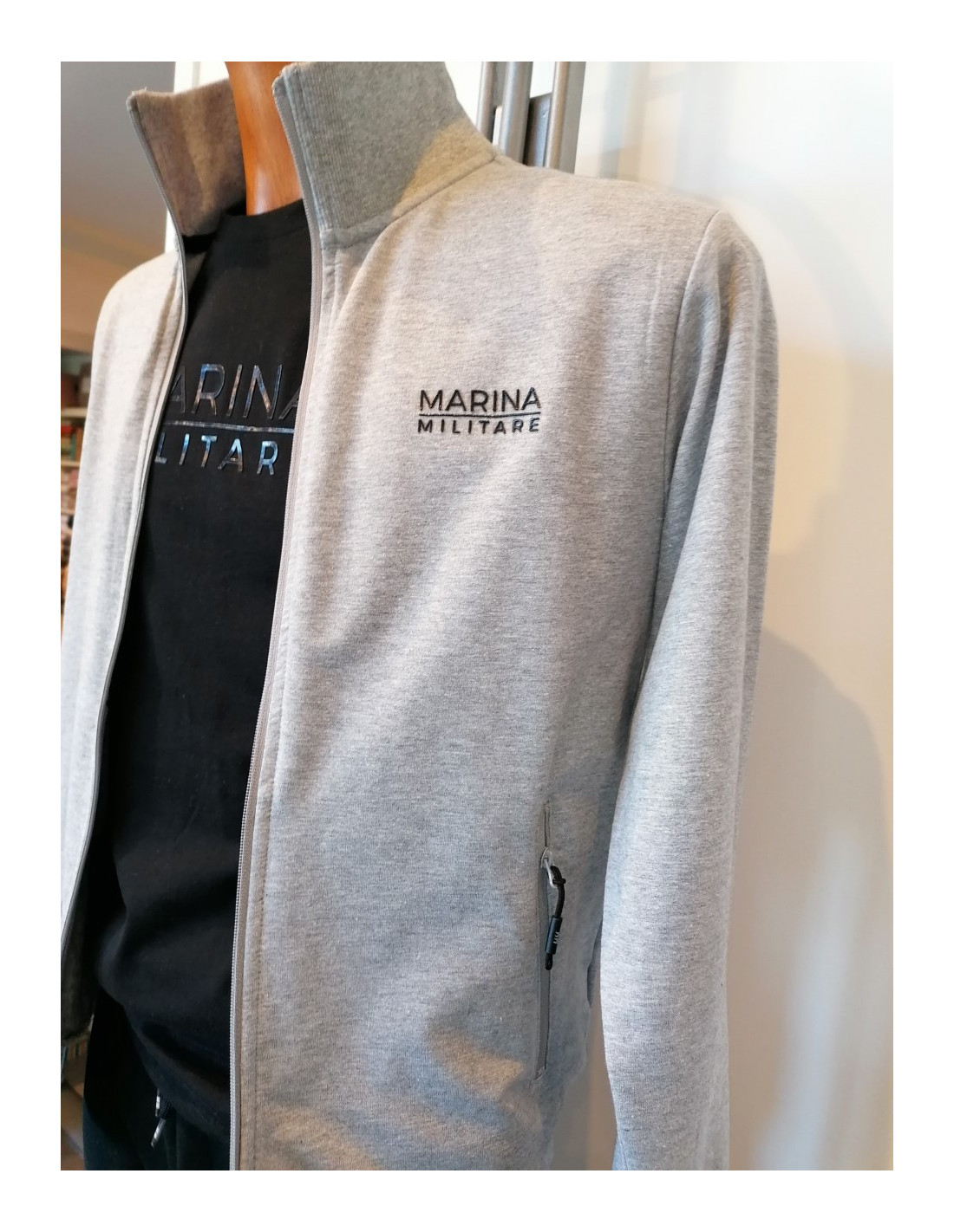 Giacca grigio chiaro melange, con ricamo logo nero, chiusura con zip, tasche interne e finiture di alta qualità