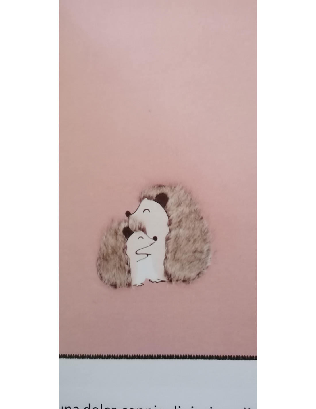 Avvolgente e tenero, questo plaid in morbido pile color rosa cipria è impreziosito da una dolce coppia di ricci ricamati, realizzati in pelliccia ecologica sfumata nei caldi toni del marrone chiaro. I due ricci si abbracciano con delicatezza, trasmettendo un senso di intimità, affetto e calore.