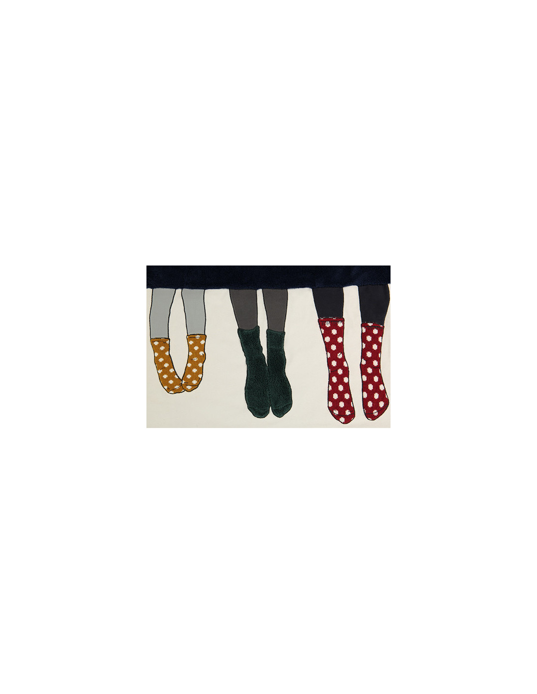 Morbida e accogliente, presenta un fondo soffice in contrasto e un ricamo dettagliato arricchito da simpatiche applicazioni di calze con pattern diversi: un design giocoso che ricorda piedini che sbucano da sotto la coperta, perfetto per portare calore e allegria in ogni ambiente.