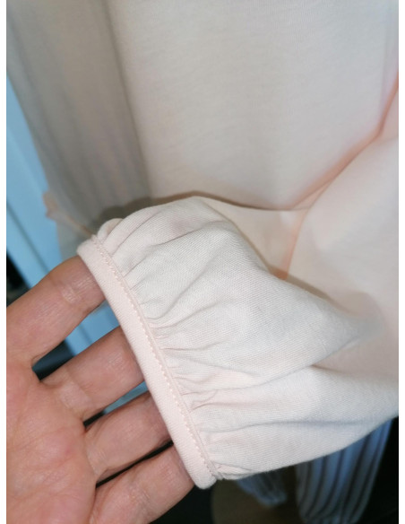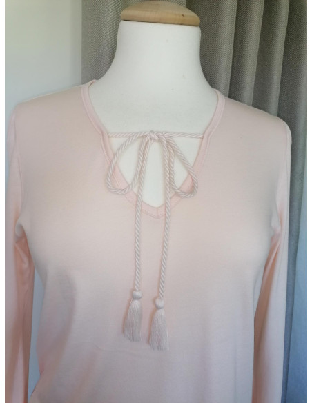 La casacca tinta unita color rosa pesca è impreziosita da un romantico volant, che dona un tocco femminile ed elegante.
