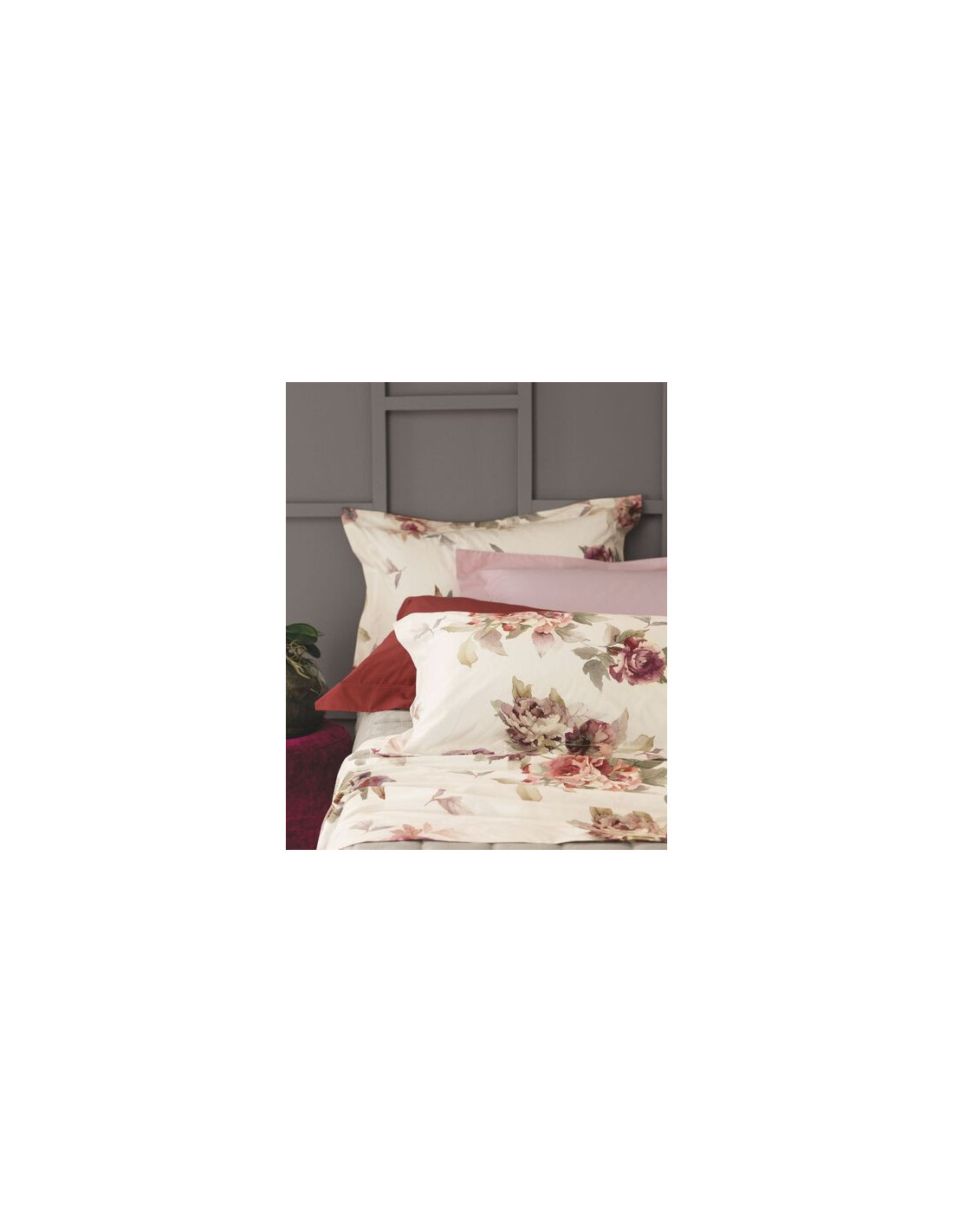 Completo lenzuola matrimoniale con elegante stampa floreale su fondo chiaro. Il lenzuolo sotto con angoli è realizzato in percalle tinta unita, per garantire comfort e praticità.