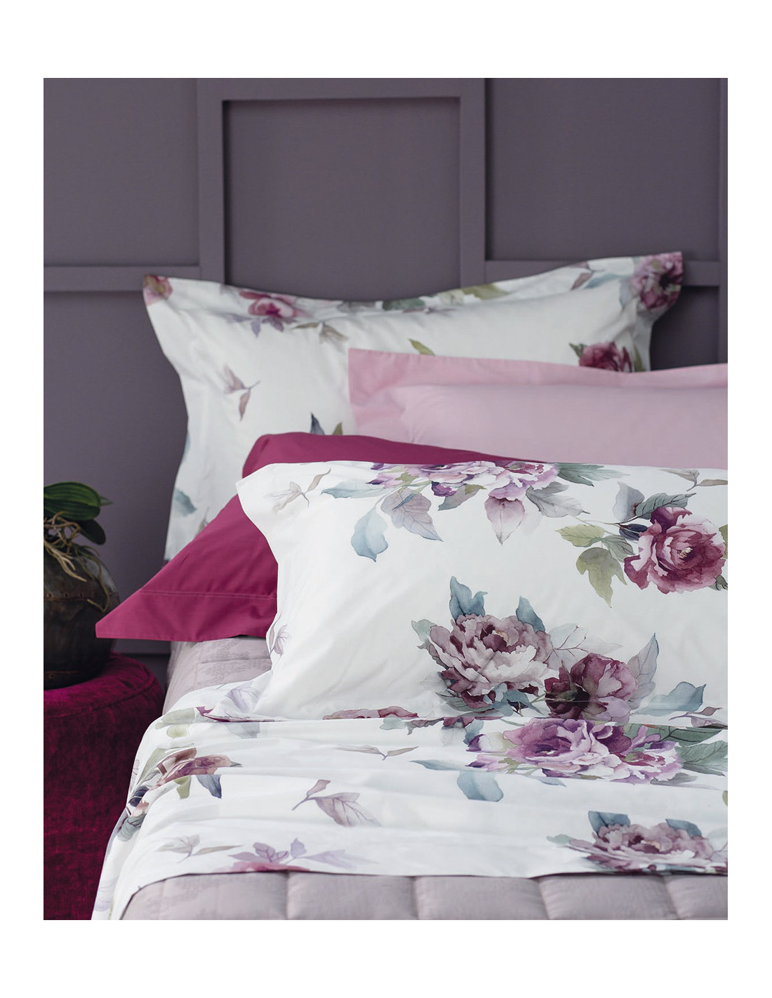 Completo lenzuola matrimoniale con elegante stampa floreale su fondo chiaro. Il lenzuolo sotto con angoli è realizzato in percalle tinta unita, per garantire comfort e praticità.