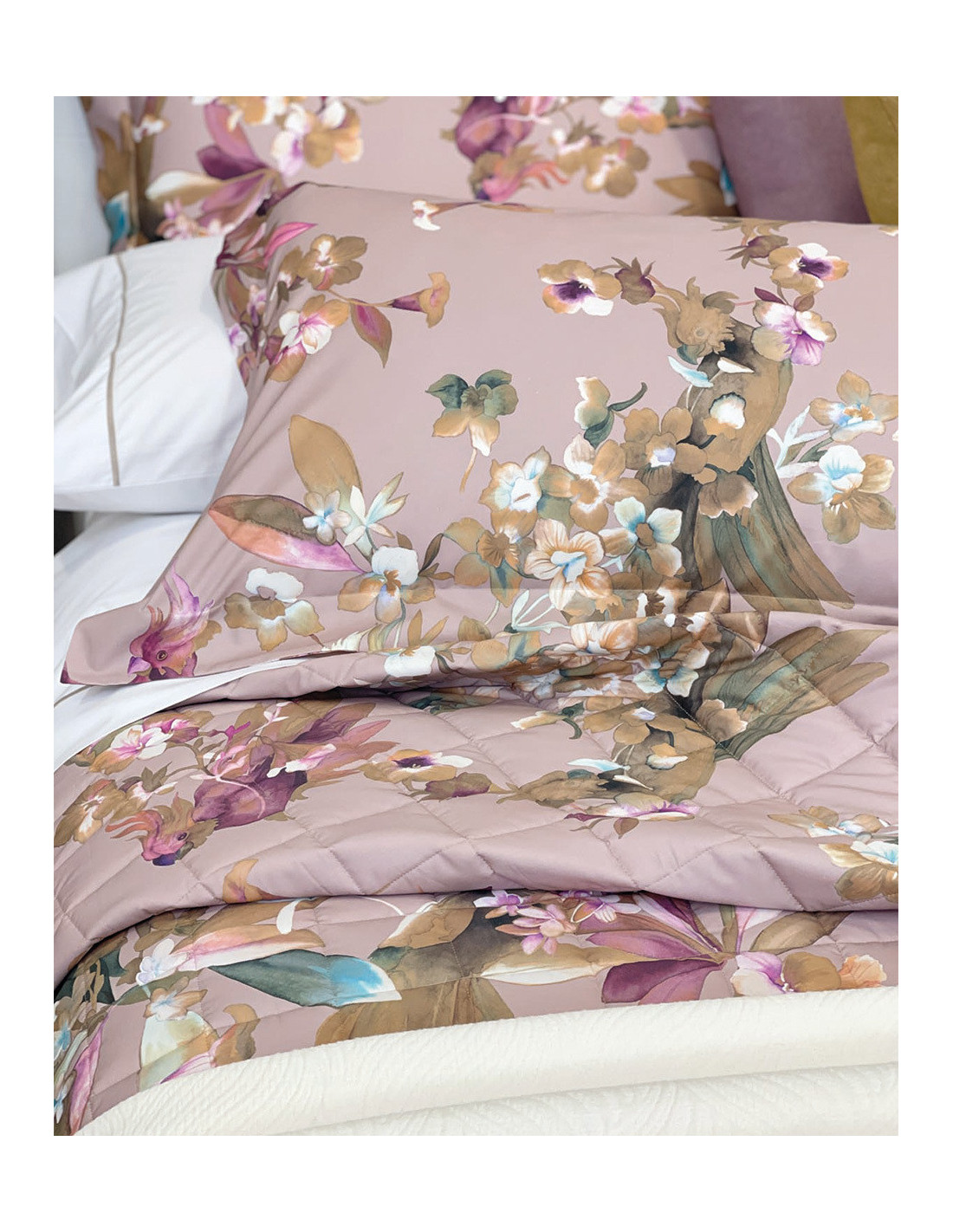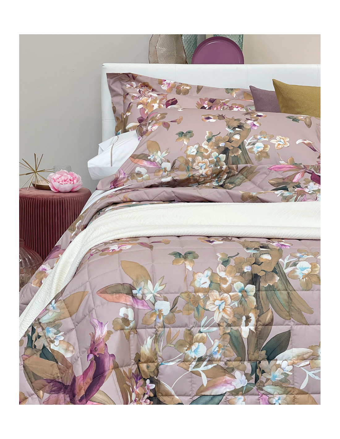 Fresco ed elegante copriletto matrimoniale trapuntato, realizzato in percalle di cotone 200 TC con raffinata stampa all over. Ideale per la stagione primavera/estate, dona alla camera da letto uno stile moderno e leggero mantenendo il giusto comfort durante la notte.